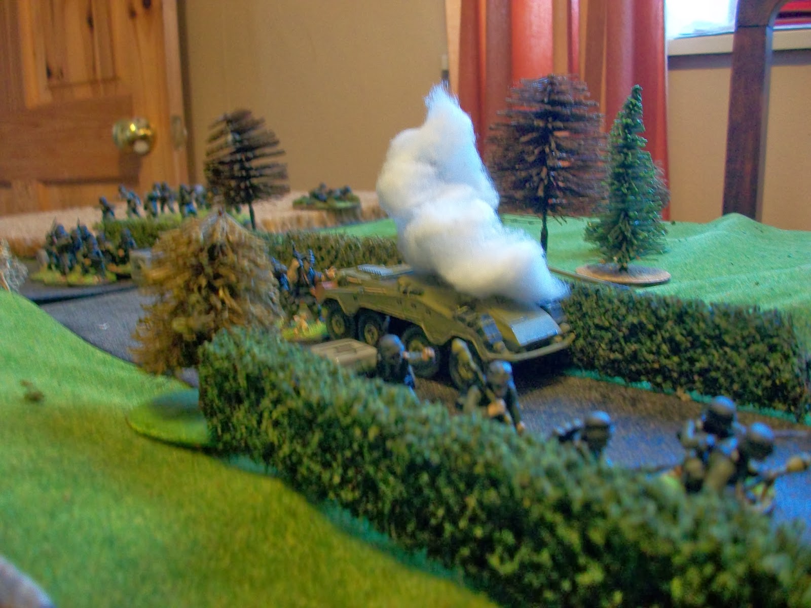| After my Puma Shot at, and missed the M8, Harry returned the favour and knocked out the Puma! What made it worse is that I'd positioned my HQ behind the Puma, so it couldn't reverse out of the way!! |
